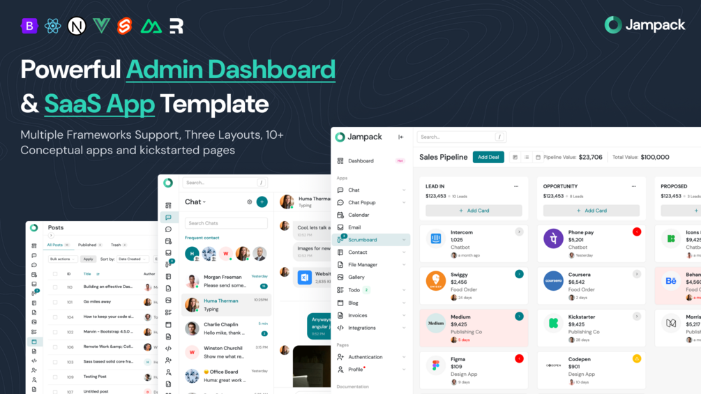 Jampack is a powerful, modern, and highly customizable admin dashboard framework built on Bootstrap 5, designed to support multiple layouts and multiple front-end frameworks. Whether you're building a CRM, CMS, SaaS platform, or project management tool, Jampack provides a scalable foundation that adapts effortlessly to your workflow